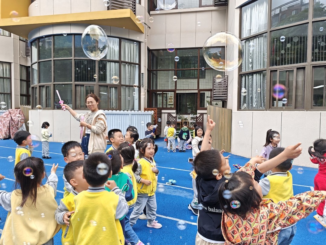 初夏的阳光下,随风飞舞的泡泡闪烁着亮晶晶的光芒!小一班的孩子们追逐着泡泡抓着、跑着、跳着,别提多开心啦!透过泡泡,童年的快乐在阳光下熠熠生辉!