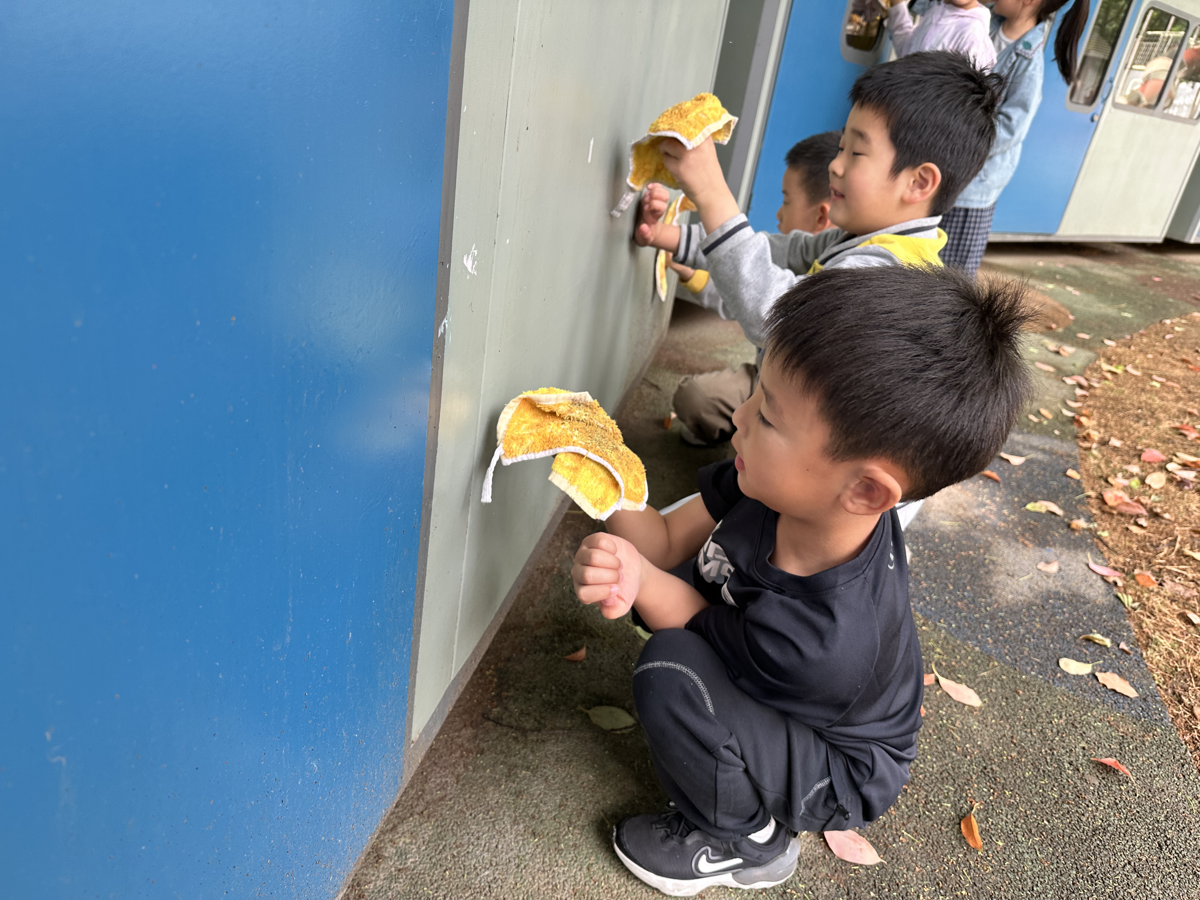 又到了每周一次的劳动日,我们分工明确:有的擦小火车的车身,有的擦窗户,有的捡树叶,有的捡树枝,在大家的齐心协力下,我们的环境又变得干净了起来,劳动真快乐呀!
